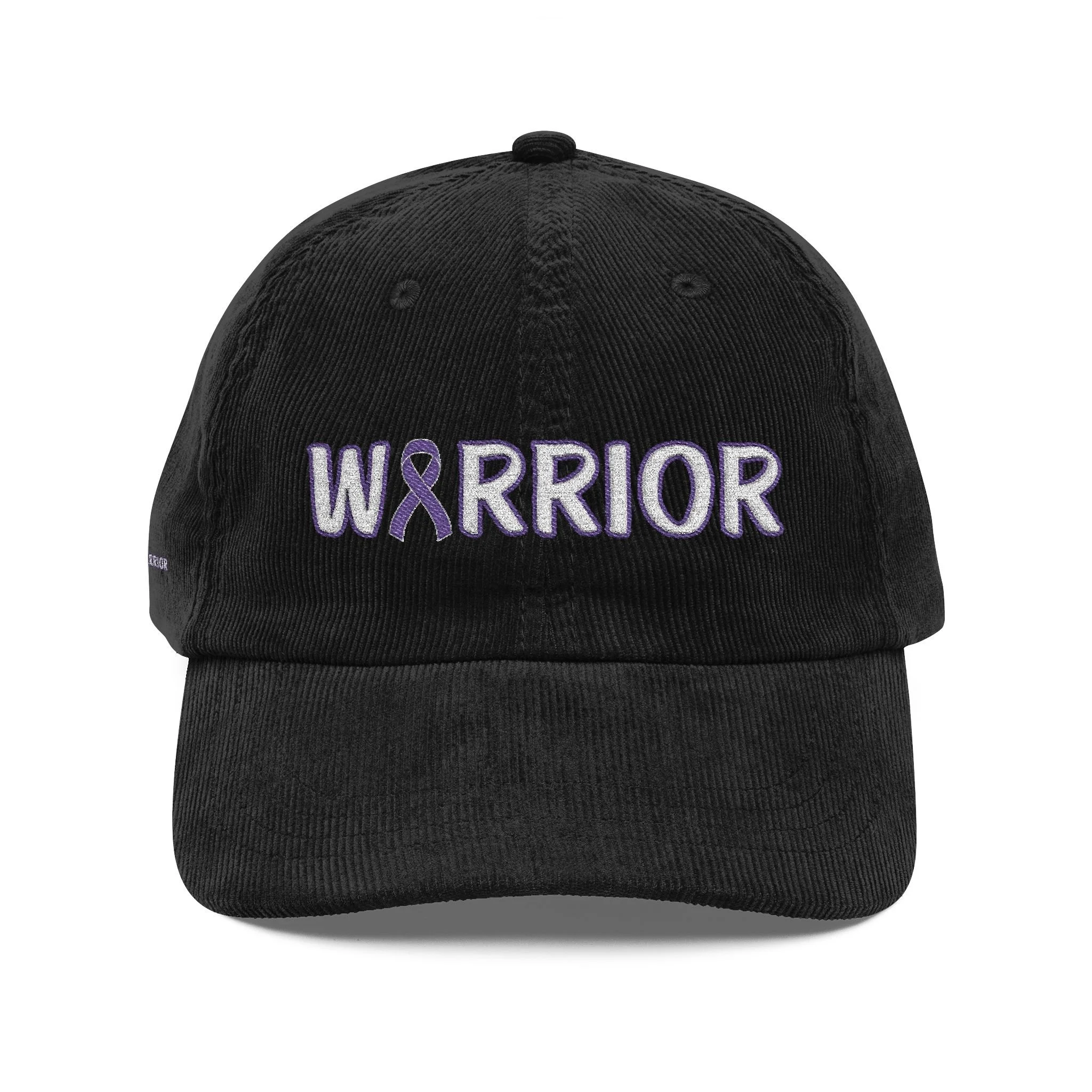 With bold purple embroidery on a soft black corduroy base, this hat embodies resilience, awareness, and community. The front proudly reads WARRIOR, with the purple ribbon woven into the design as a symbol of hope and courage.